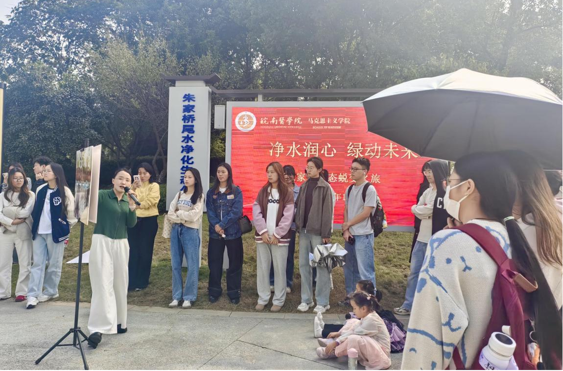 此次活动,师生同行,马克思主义学院张佳慧老师担任现场讲解。她首先向同学们讲述了朱家桥湿地从昔日“脏乱差”的滩涂地,到今天成为人与自然和谐共生的生态栖息地的华丽蜕变,进而结合展板图示,深入剖析了公园的净化原理。跟随张老师的脚步,同学们依次探访了潜流人工湿地、强化人工湿地和生态涵养塘三大功能区,亲眼见证“污水变清泉”的科技与生态合力,直观理解了城市“净水器”如何为长江注入清流。