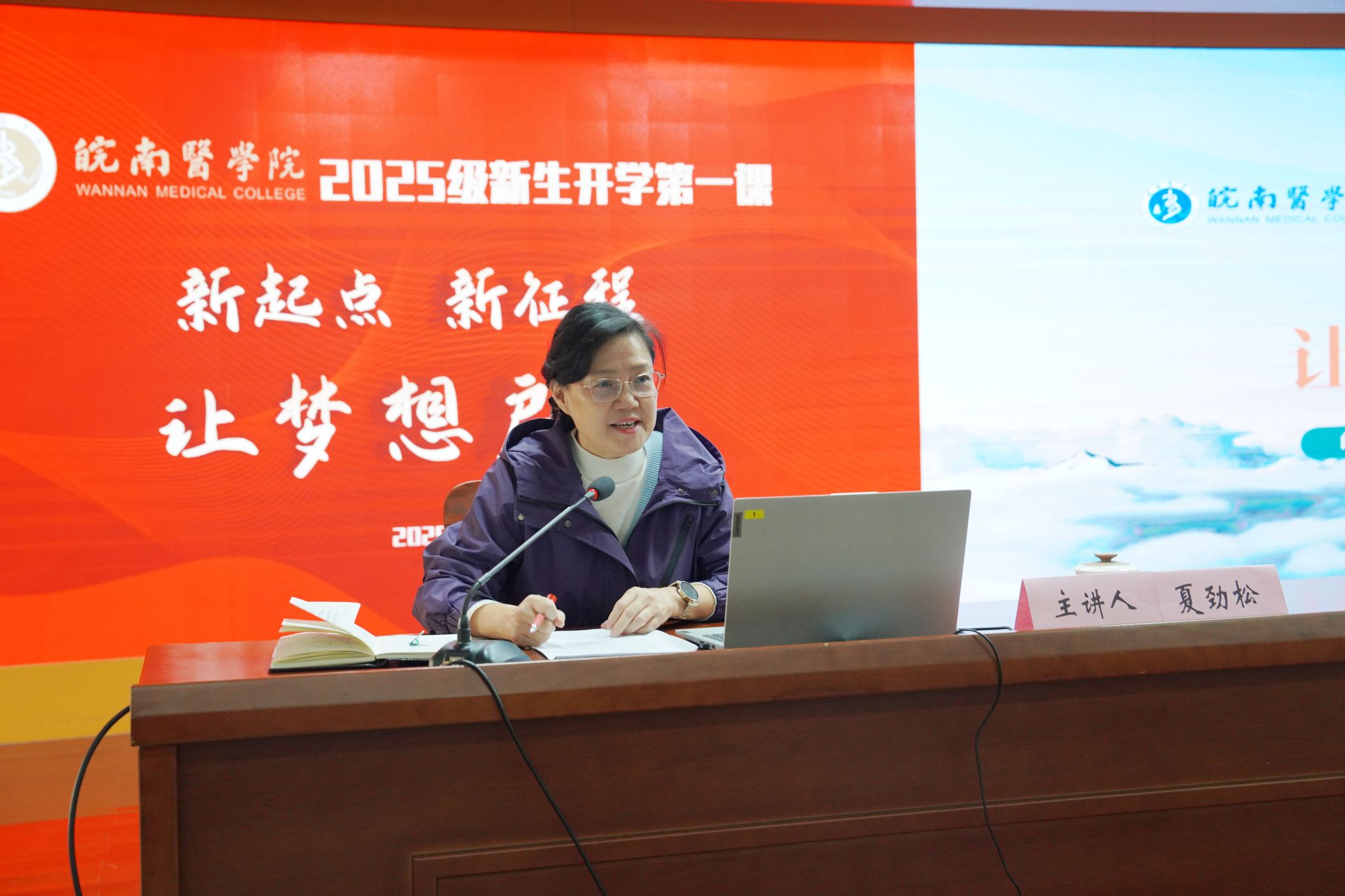 学校高度重视“大思政课”建设,持续推动思政课实践教学守正创新,切实提升思政课培根铸魂的育人实效。11月12日,学校党委书记夏劲松以“新起点 新征程 让梦想启航”为题,为2025级全体新生讲授了一堂内涵深刻、启智润心的“开学第一课”。课程围绕“认识新起点”“确立新目标”“适应新环境”“实现新梦想”展开,引导新生深入理解大学意义、科学规划学业生涯、主动融入时代发展,在与国家进步和学校建设同频共振中成长成才。夏劲松寄语全体新生要秉承校训,发扬皖医精神,博极医源、精勤不倦,在青春的赛道上奋力奔跑,成就更好的自己。
