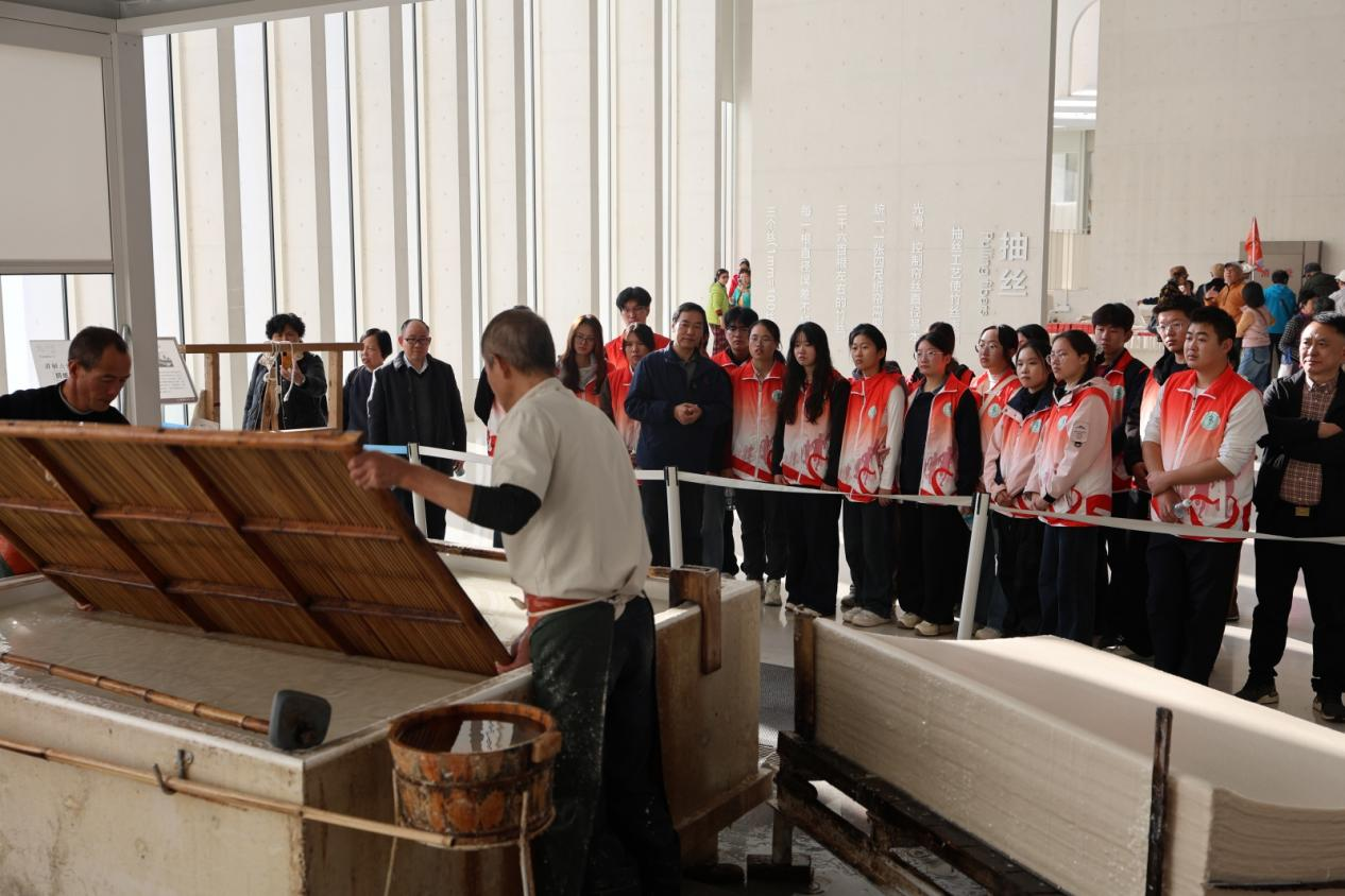 当日下午,师生走进泾县宣纸文化园。作为人类非物质文化遗产“宣纸传统制作技艺”的核心传承基地,这里承载着中华文明千年不绝的匠心文脉。李飞飞老师以“纸寿千年 匠心永续”为题,讲述宣纸的历史流变与文化价值。国家级非遗传承人毛胜利现场演示宣纸制作技艺,讲解从青檀皮到成纸的繁琐工序。部分师生亲手体验捞纸环节,在一沉一抬间感受传统工艺所蕴含的专注与坚守.